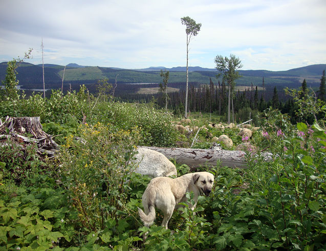 In the summer of 2013, we had a contract to graze one flock of 1,500 sheep on a plantation way out in the forest North West of Ft St James, British Columbia. There were three of us shepherds, three sheep herding dogs (2 Australian Kelpies and a New Zealand Huntaway) and four livestock guardian dogs.